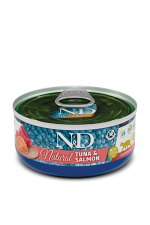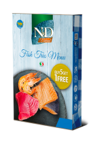 N&D Natural Fish Trio Menu е допълваща мокра храна в консерва за котки в зряла възраст – с риба тон, с риба тон и сьомга, с риба тон и скариди.