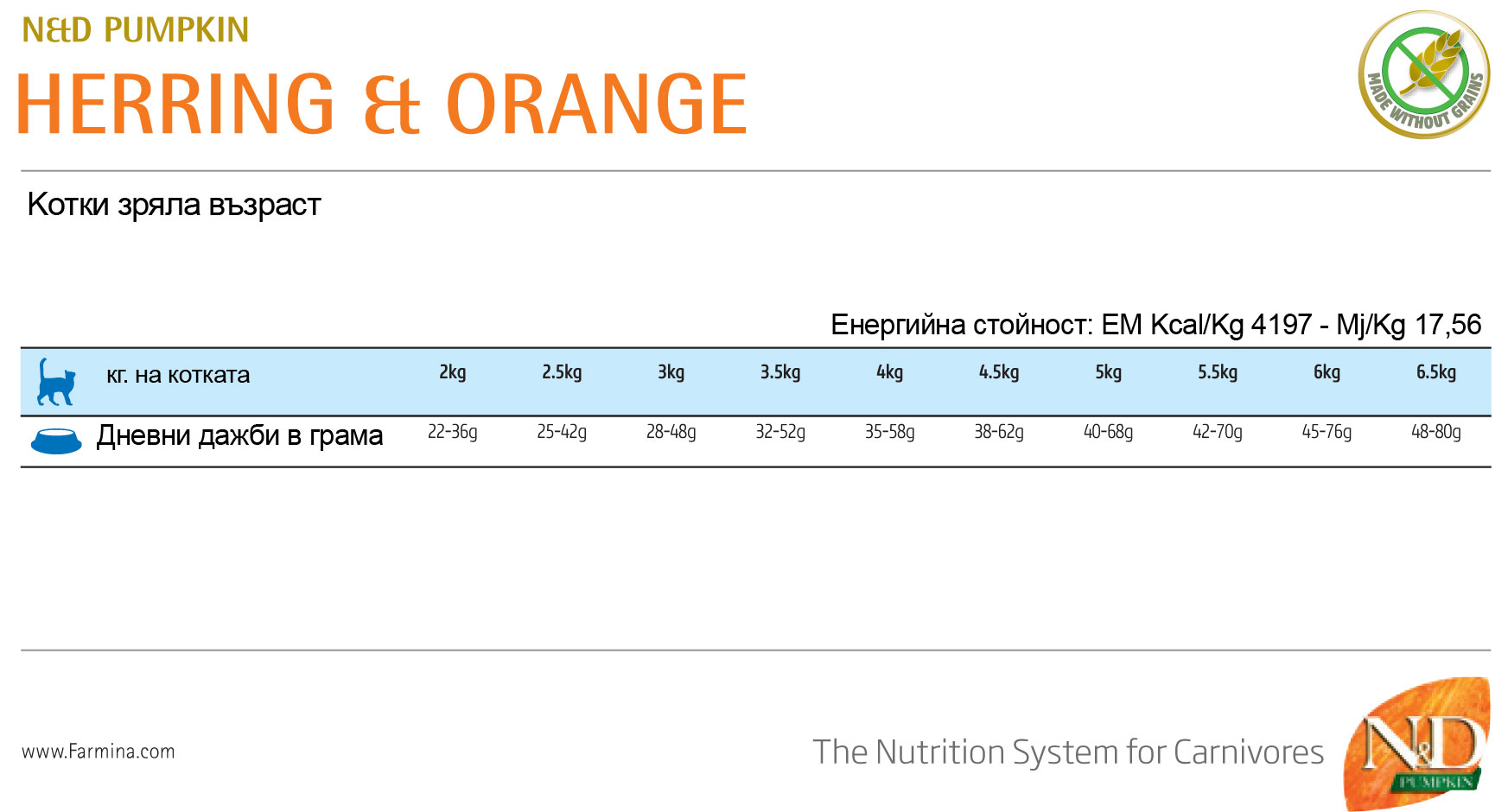 Пълноценна суха храна без зърнени култури за котки в зряла възраст. Рецепта с херинга, тиква и портокал.