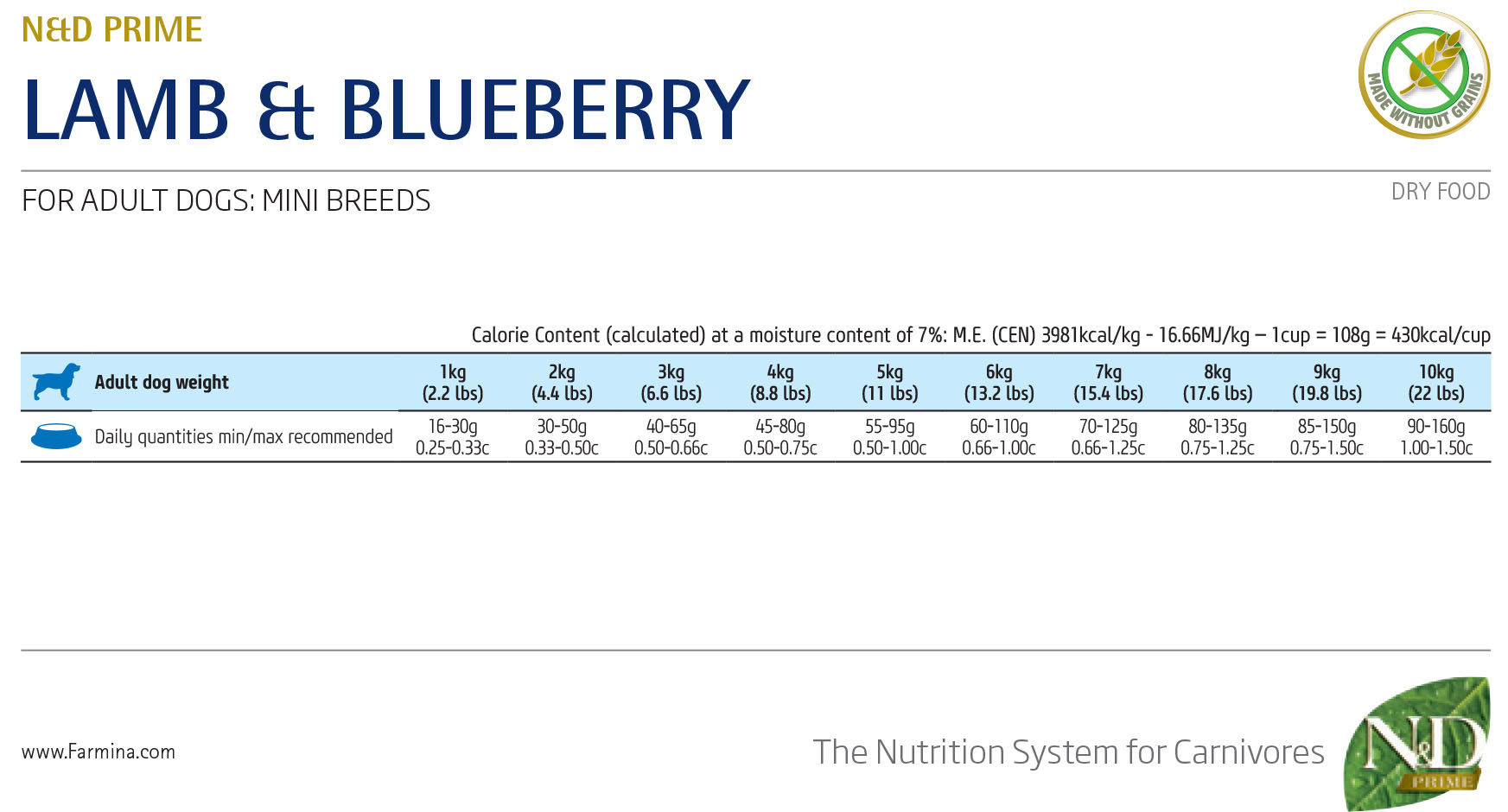 N&D Prime Lamb & Blueberry Adult Mini – суха храна без зърнени култури за кучета над 1 година от дребни породи, с агнешко и боровинки