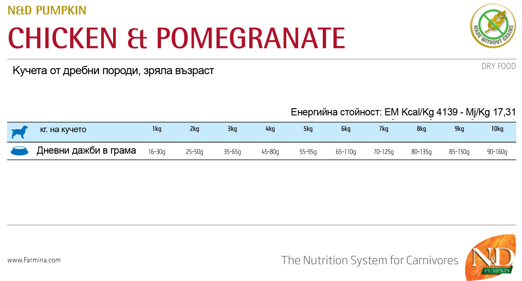 N&D Pumpkin Chicken & Pomegranate Adult MINI – суха храна без зърнени култури за кучета над 1 година от дребни породи, с пилешко, тиква и нар