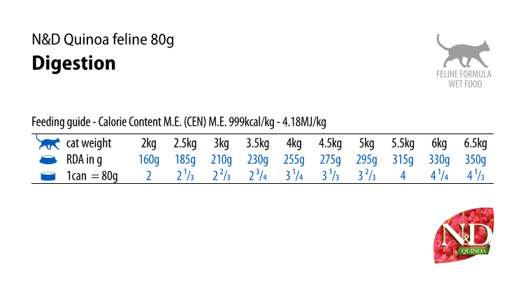 Инструкции за хранене: препоръчва се преди употреба да се потърси мнението на ветеринарен лекар. Лесносмилаема храна. Препоръчителна продължителност на употреба: първоначално до 12 седмици. Сервирайте храната във вида, в който е, като следвате дневните дажби, указани в таблицата. Дневните дажби, показани на приложената схема са само индикативни и може да е необходимо да бъдат регулирани, за да се постигне подходящо телесно тегло.  Дневните дажби могат да варират спрямо породата, средата, физическата активност, темперамента или състоянието на тялото. Дневната дажба може да бъде разделяна на две или повече хранения за деня. Препоръчително е първоначално да смесвате N&D със старата храна. По всяко време трябва да има вода в наличност. След като бъде отворена, съхранявайте консервата в хладилник до 48 часа.