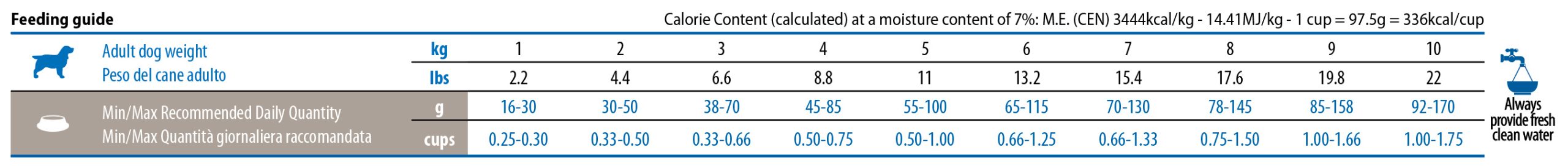 Аналитични съставки: Суров протеин 25,00%; Сурова мазнина 12,00%; Сурови влакнини 1,90%; Влага 9,00%; Сурова пепел 7,50%; Калций 0,90%; Фосфор 0,60%; Натрий 0,40%; Калий 0,60%; Магнезий 0,09%; Омега-6 мастни киселини 1,90%; Омега-3 мастни киселини 0,40%; DHA 0,20%; EPA 0,15%; Глюкозамин 1200мг/кг; Хондроитин сулфат 900мг/кг.