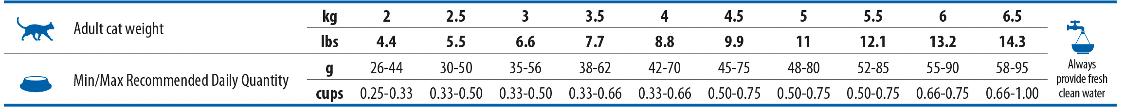 Аналитични съставки: Суров протеин 34.00%; Сурова мазнина 15.00%; Сурови влакнини 8.00%; Влага 8.00%; Сурова пепел 7.60%; Калций 1.00%; Фосфор 0.80%; Натрий 0.30%; Калий 0.60%; Магнезий 0.08%; Омега-6 2.00%; Омега-3 0.50%; DHA 0.15%; EPA 0.10%; Глюкозамин 1200mg/kg; Хондроитин сулфат 900mg/kg. Подкиселяващи урината съставки: калциев сулфат дихидрат 4000mg/kg.