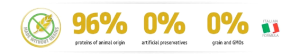 Състав: Херинга (24%), дехидратиран протеин от херинга (23%), сладък картоф, рибено масло (от херинга), сушена спирулина (5%), ленено семе , сушено годжи бери (2.5%), влакнини от грах, сушен морков, брашно от люцерна, инулин, фрукто-олигозахариди, екстракт от мая (източник на мано-олиго-захариди), сушен спанак, семена и люспи от псилиум, натриев хлорид, сушена бирена мая, куркума, екстракт от алое вера, глюкозамин, хондроитин сулфат.