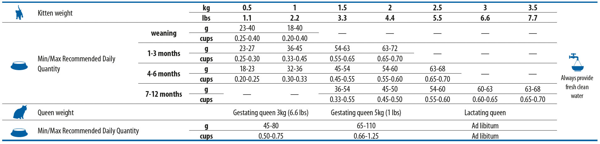 Добавки за кг. Добавъчни храни: Витамин A 19500IU; витамин D3 1300IU; витамин E 650mg; витамин C 325mg; ниацин 165mg; калциев D-пантотенат 54mg; витамин B2 21.5mg; витамин B6 9.3mg; витамин B1 10.4mg; биотин 1.55mg; фолиева киселина 1.63mg; витамин B12 0.1mg; холин хлорид 2700mg; бета-каротин 2mg; цинк (цинков хелат на хидрокси аналог на метионина): 176mg; манган (манганов хелат на хидрокси аналог на метионина): 68,8mg; желязо [железен (II) хелат на глицин хидрат]: 62,6mg; мед (меден хелат на хидрокси аналог на метионина): 17mg; DL-метионин, технически чист 5500mg; таурин 4500mg; L-карнитин 350mg. Сензорни добавки: екстракт от зелен чай 100mg; екстракт от розмарин. Антиоксиданти: екстракти на токофероли от растителни масла.
