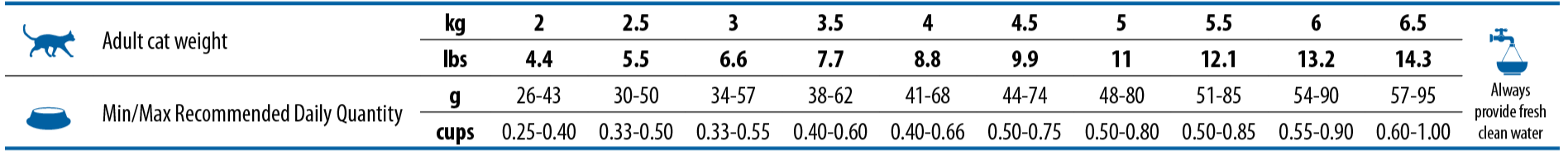 Аналитичен състав: суров протеин 32,00%; сурови мазнини 11,00%; сурови влакнини 2,70%; влага 8,00%; сурова пепел 8,30%; Калций 1,10%; Фосфор 0,90%; Магнезий 0,09%; Омега-6 2.00%; Омега-3 0,40%; DHA 0,15%; EPA 0,10%; Таурин 0,18%.