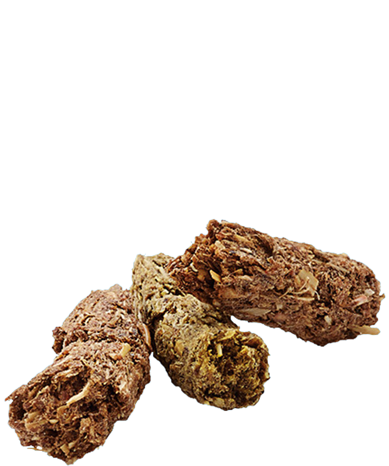 Състав: производни от растителен произход (тимотейка, треви и билки: 7%), плодове (бъз: 5%), минерали, семена (ленено семе: 2%), фрукто-олиго захариди (0.3%), невен (цвят), юка на прах.