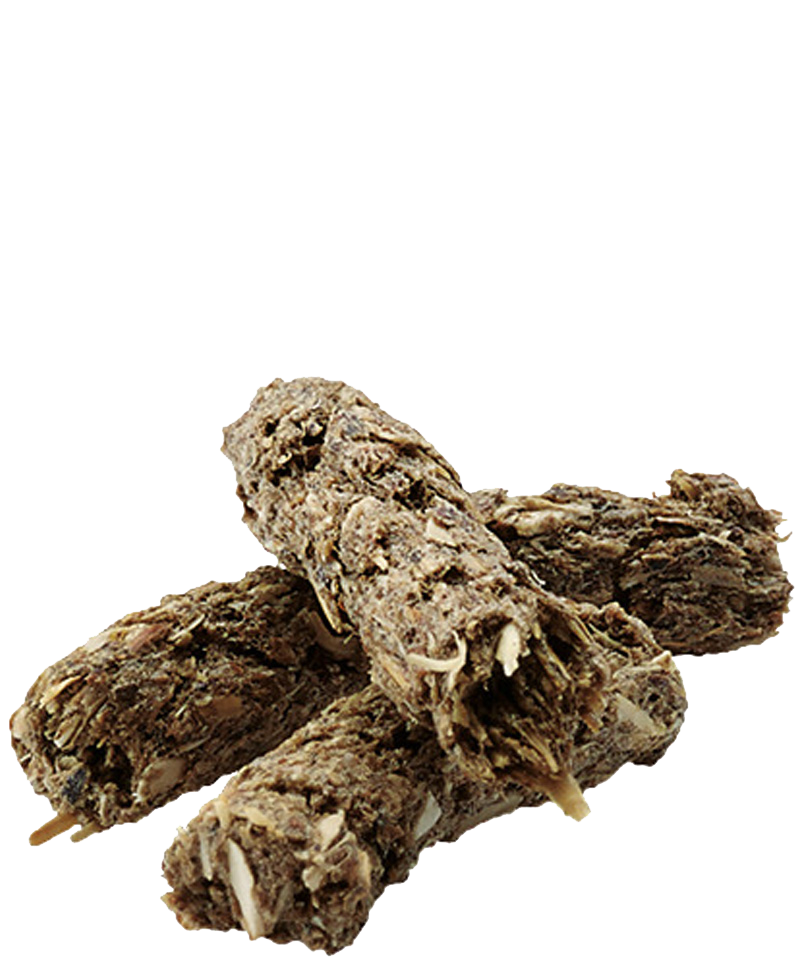 Състав: производни от растителен произход (тимотейка, треви и билки: 6%), плодове (червени боровинки 5%), зеленчукови протеинови екстракти, семена (ленено семе: 2%), минерали, фрукто-олиго захариди (0.3%), невен (цвят), юка на прах.